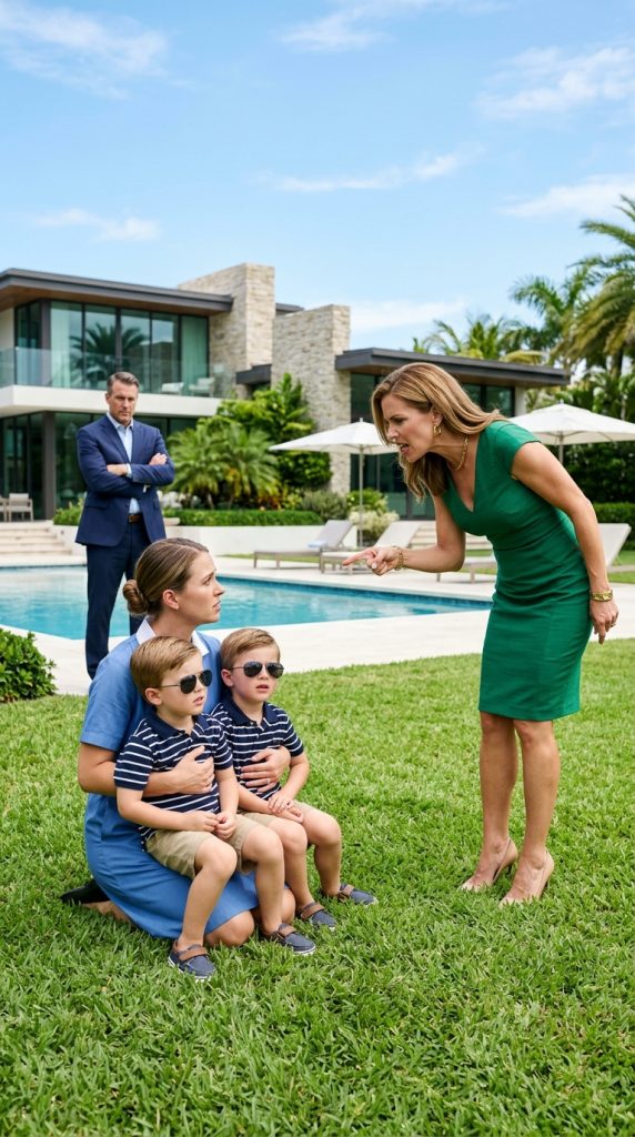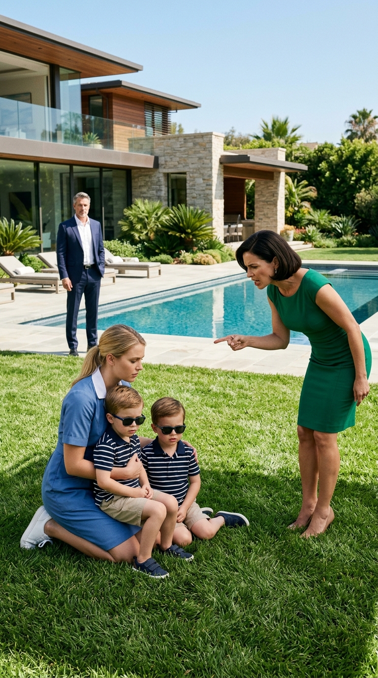 On the sun-warmed stone path, Nora knelt, her arms wrapped protectively around the twins, Ethan and Lucas, shielding them with her own body. The boys were shaking, their tiny hands clutching her pale blue uniform.
