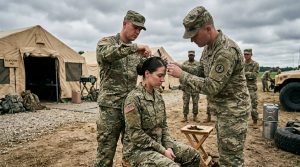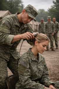 At the edge of Third Platoon stood Private Alara Hayes—steady, controlled, known for flawless execution. Her dark hair was tightly braided beneath her cap. One loose strand—barely visible—caught the light.