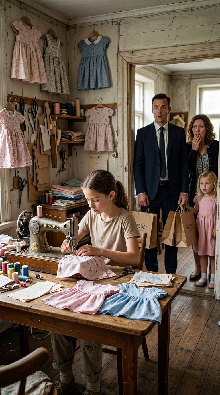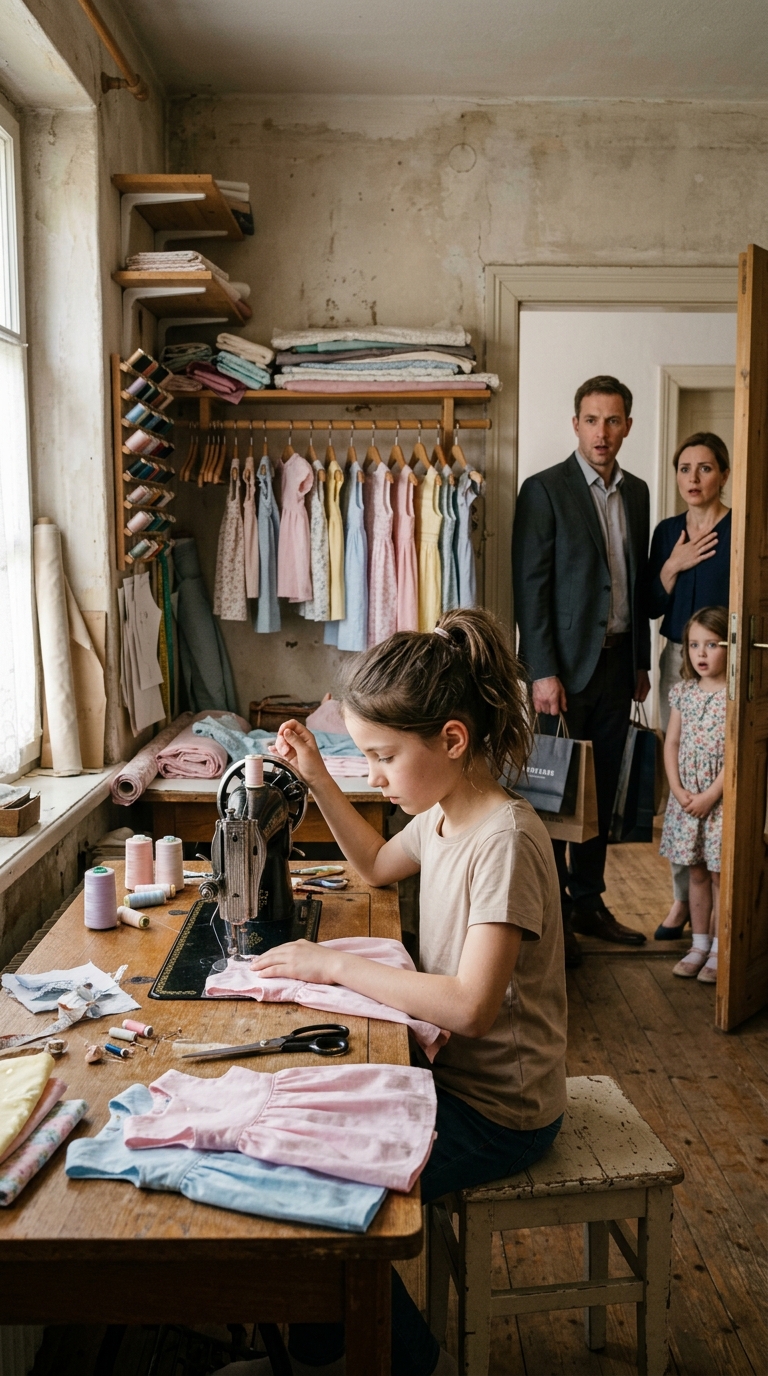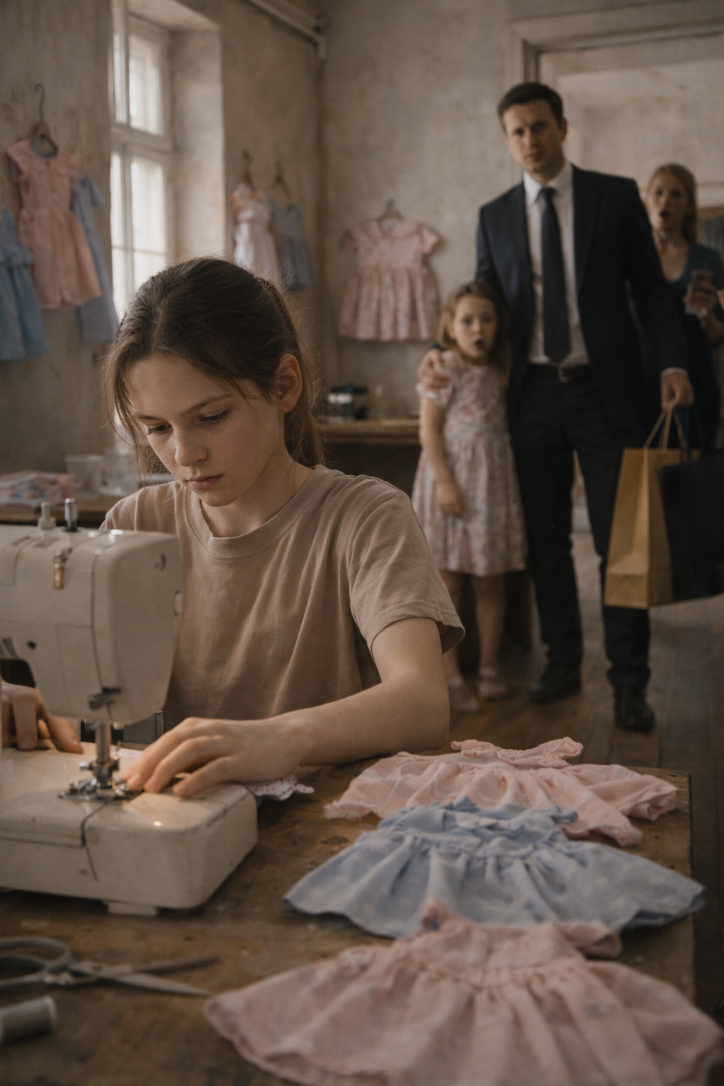 Sunlight slipped through a broken window and stretched across a worn wooden table. Sitting there was a little girl—no older than nine or ten—leaning over an old sewing machine. Her hair was tangled, her face smudged with dirt. A strip of cloth wrapped her wrist, darkened where blood had soaked through. The machine rattled loudly each time she pressed the pedal.