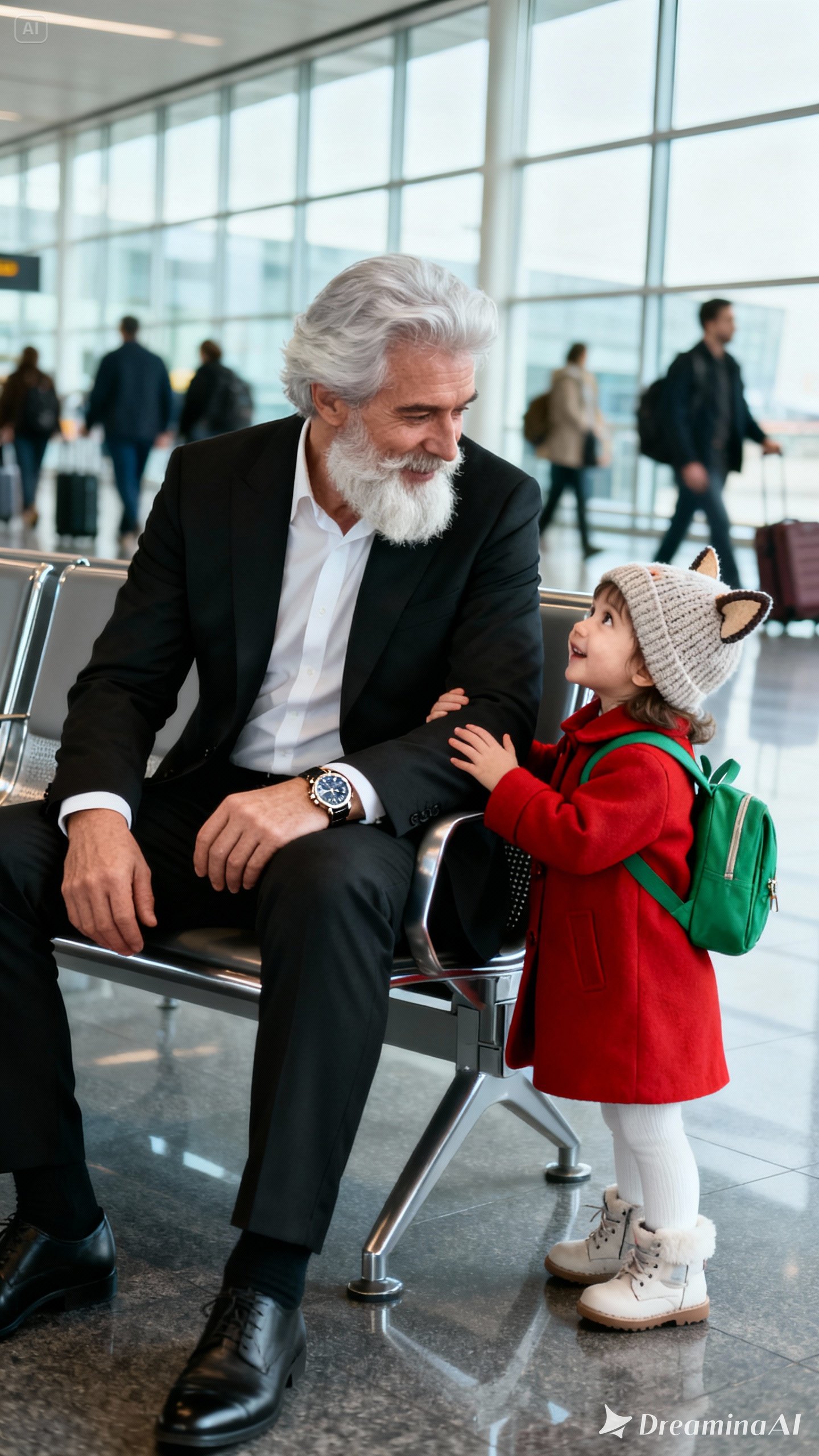 The owner of that little hand was a girl no older than three. Her round cheeks and red coat, covered in fluff, made her seem almost angelic. A beige hat with cat ears hung low over her eyes, and she smiled as though the world itself were a joke, as if the man in the dark suit with the stern demeanor were just another adult to ask for a favor.
