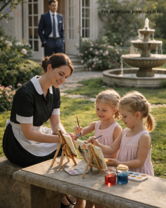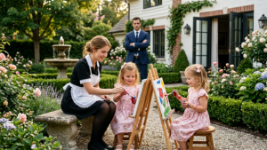 Lila had been hired three months earlier as a housekeeper. She was twenty-three, quiet, respectful, and dependable. Owen knew she worked hard and spoke gently, but he had never imagined seeing her outside, sleeves rolled up, teaching his daughters how to mix colors on paper plates.