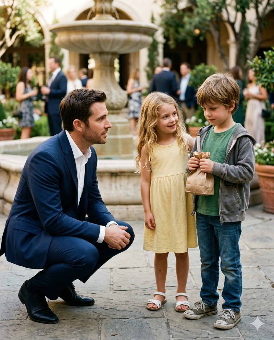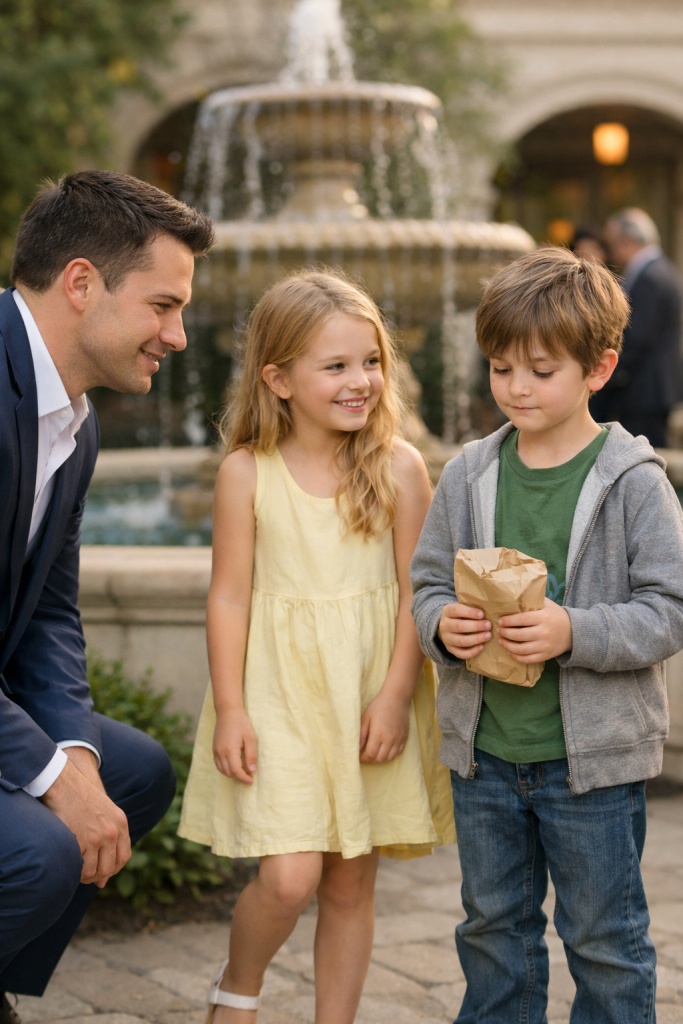 Near the edge of the fountain, where bright marble faded into shadow, sat a boy. He looked around seven. His clothes were worn, sleeves too short, shoes mismatched. A crumpled paper bag rested carefully in his lap, as if it held something valuable.