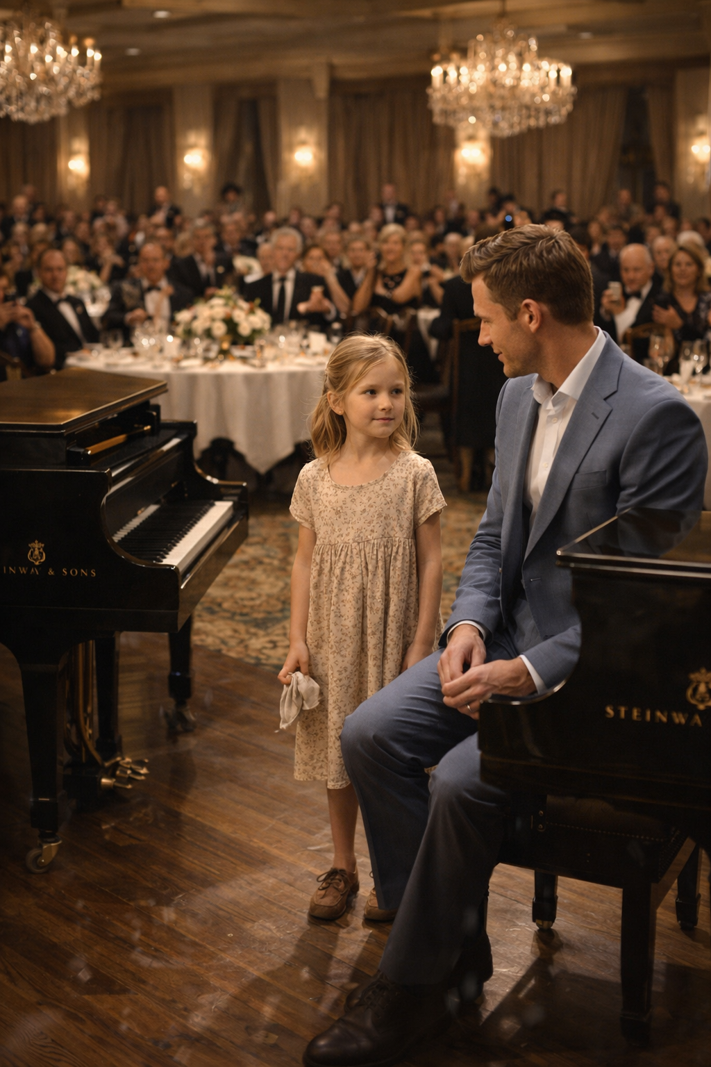 At that exact moment, a side door opened quietly, and a small girl stepped into the hall. She clearly did not belong there, and everyone saw it immediately. Her dress was simple, her shoes worn, and her presence disrupted the illusion the room had so carefully constructed. Ignoring the murmurs spreading among the guests, she walked straight toward the stage and, in a calm voice that didn’t match her size, asked if she could play.