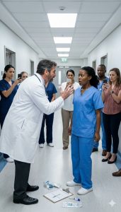 The next morning, Mercy General held an emergency all-staff meeting. Maya stood before hundreds of employees, the faint bruise on her cheek visible but proud.