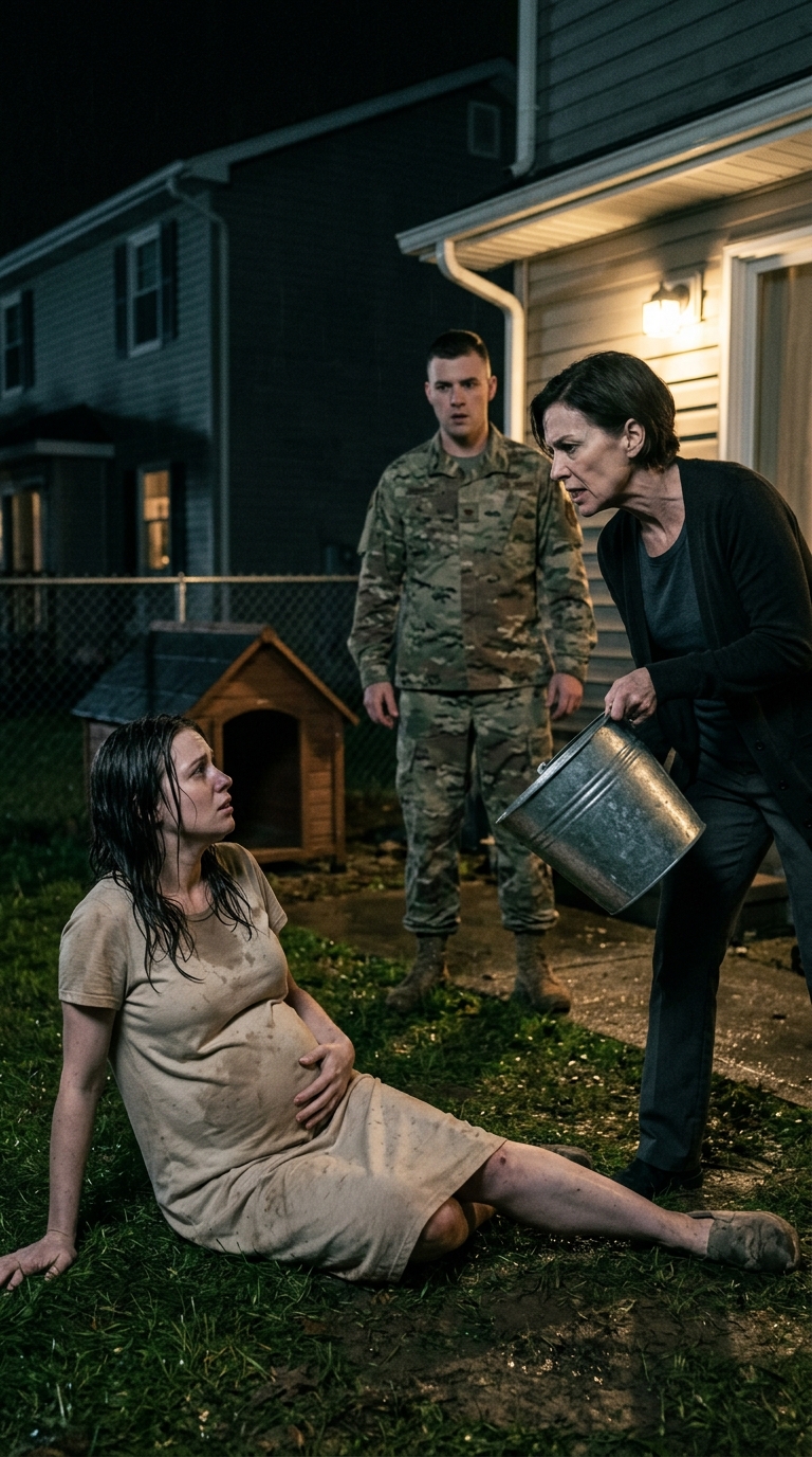Margaret stumbled back, the empty ice bucket clanging against the concrete. She frantically smoothed her designer blouse, trying to rebuild the composed, superior image she had always relied on, even as two dozen silent, furious soldiers stood watching.