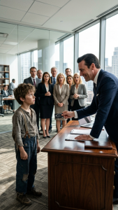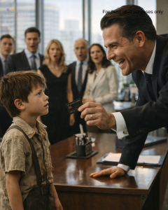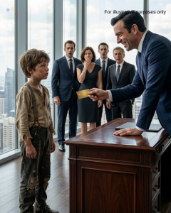 He couldn’t have been older than ten. His sneakers were worn, his shirt faded and clearly second-hand, his hair uneven and unkempt. Yet he stood firmly at the glass counter inside the VIP lounge of the city’s most elite financial tower, surrounded by people who measured value in tailored suits and crystal glasses.