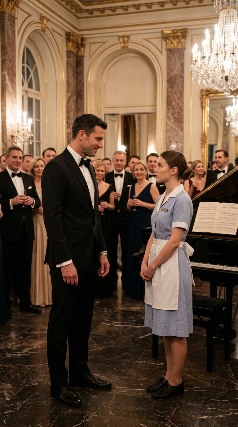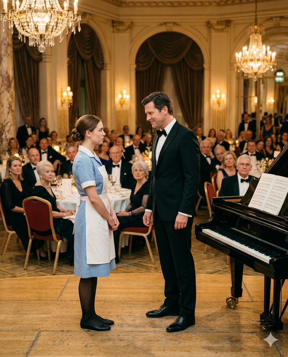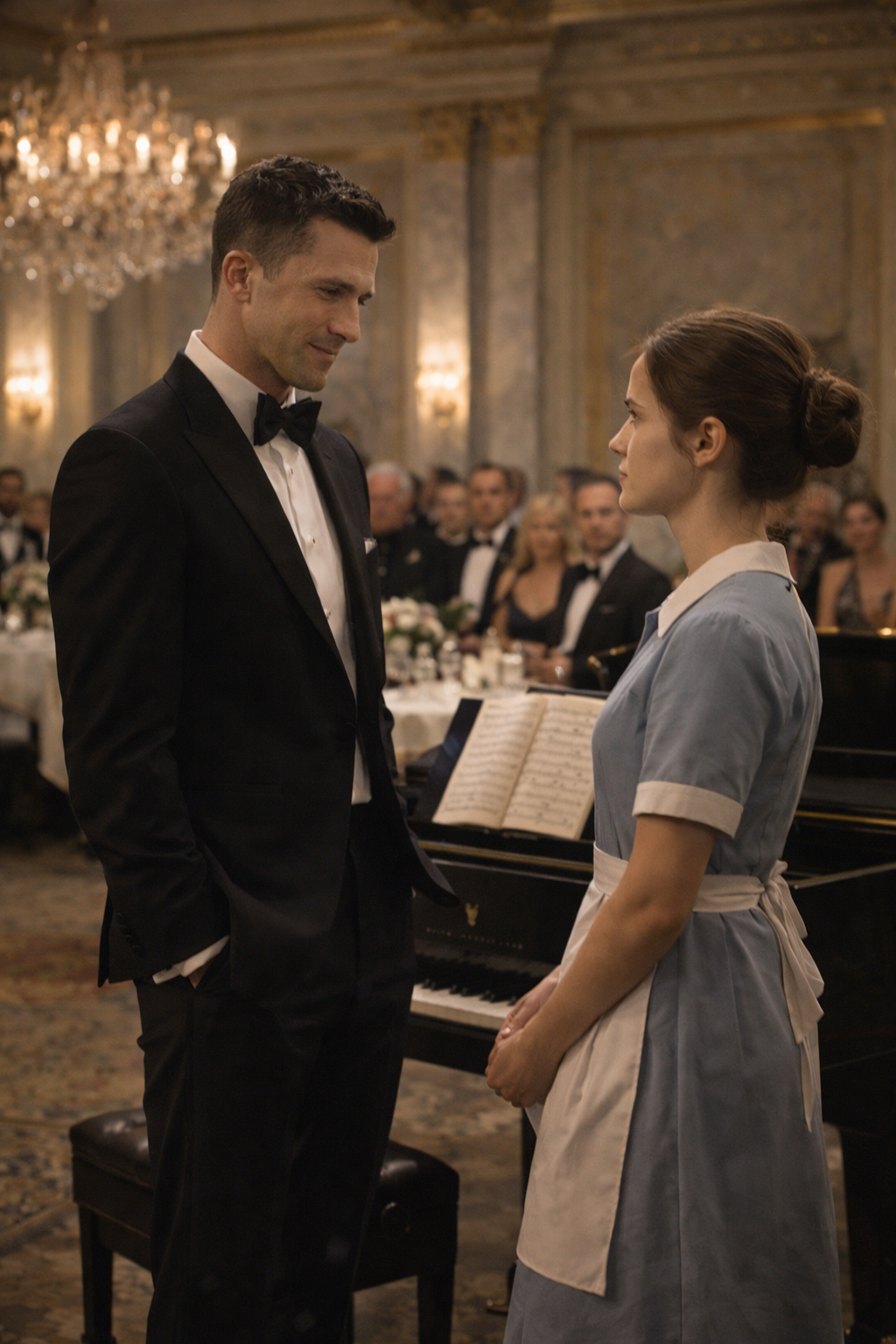 Elena stood at the edge, gripping her tray. Her heart pounded so loudly she thought others might hear. She looked at the piano, then at Marcus, then at the smiling faces around her.