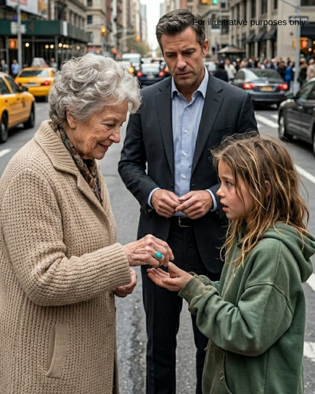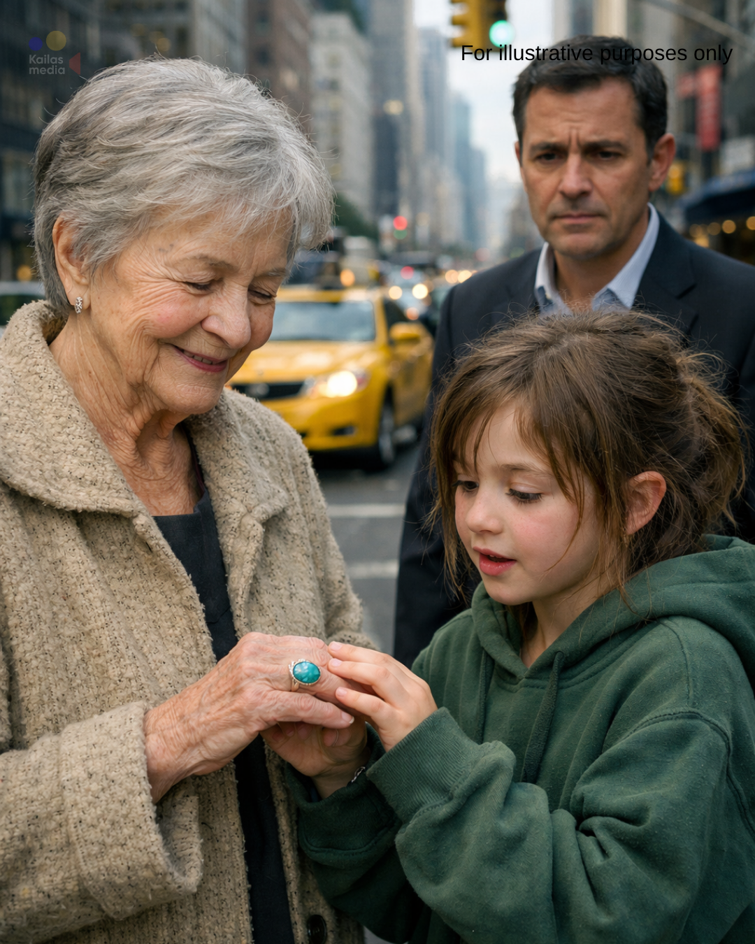 The girl raised a small, trembling finger and pointed at the ring on Evelyn’s hand—a rare white gold and platinum piece set with a deep blue sapphire that shimmered under the dim lights.