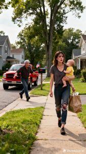 The afternoon sun beat down on the cracked sidewalk as I limped past Mrs. Chen’s house, past the corner where the stop sign leaned slightly to the left, past all the familiar landmarks of a neighborhood that had stopped feeling like home months ago. Eli’s tiny fingers tangled in my hair, tugging occasionally, his weight making my shoulder ache.
